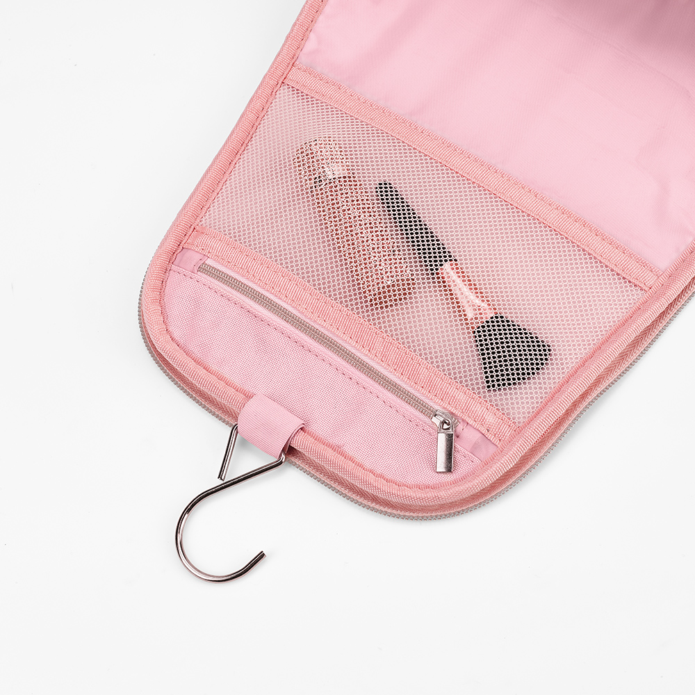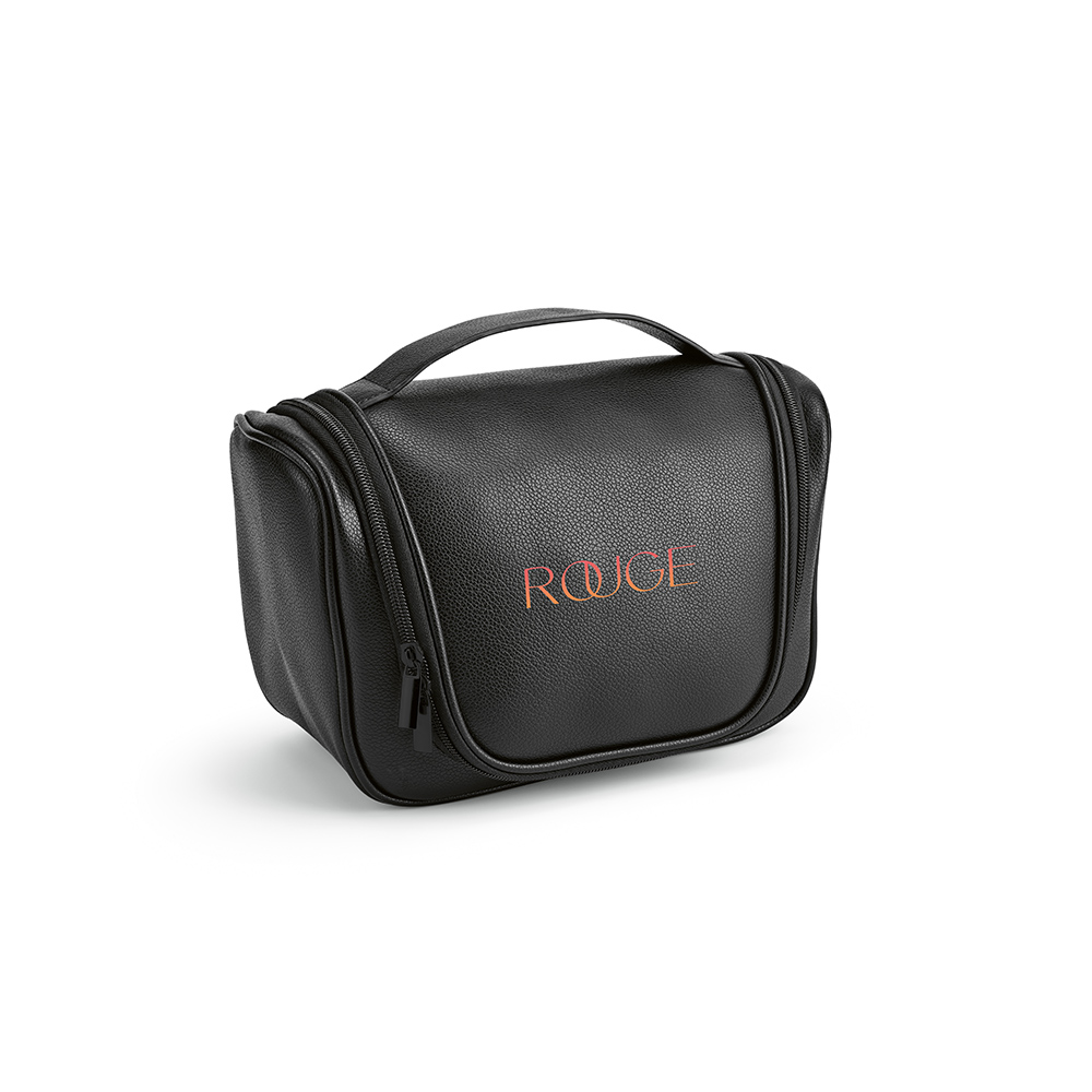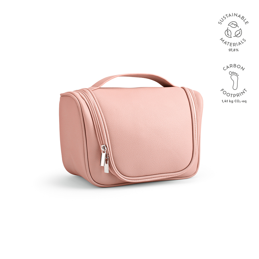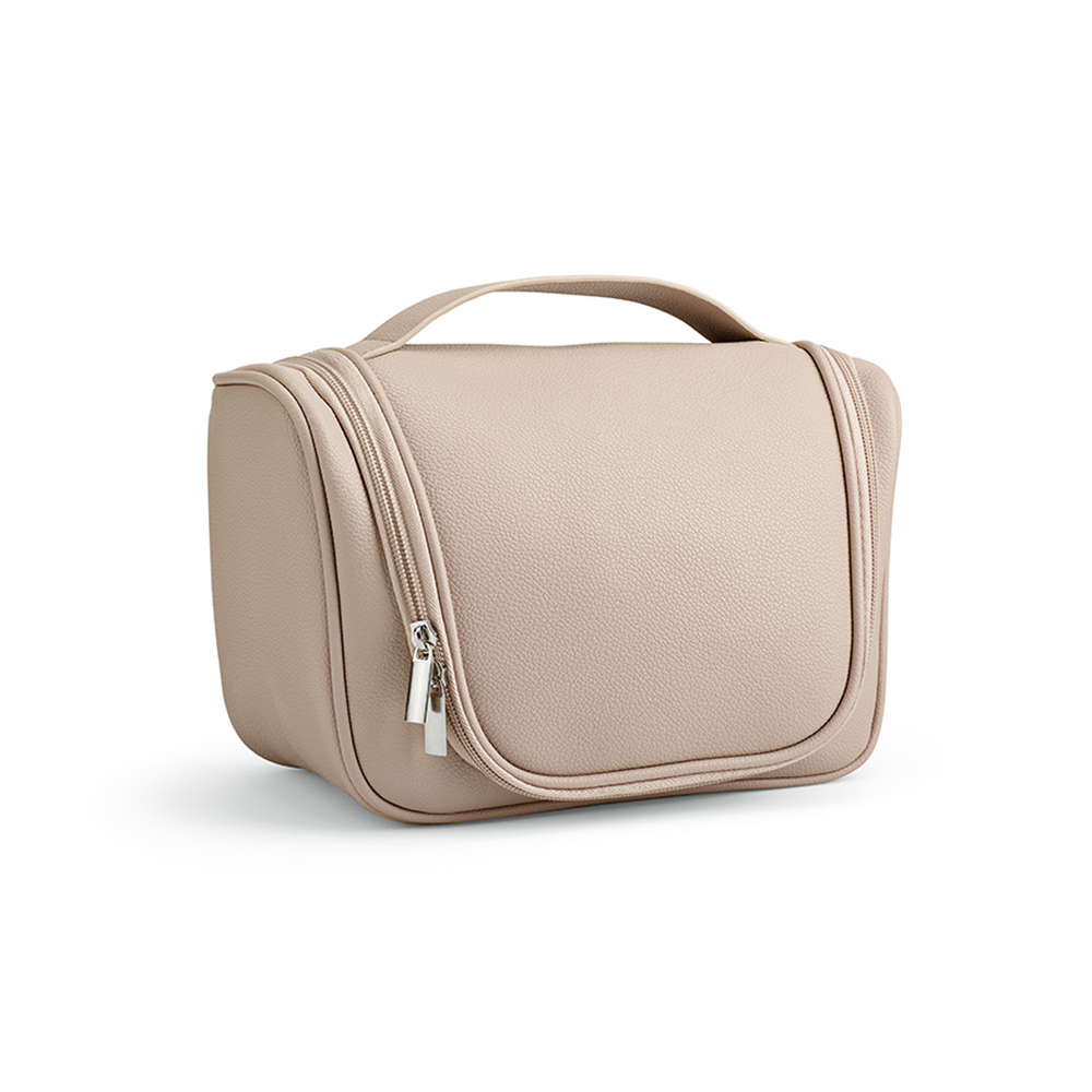 Shanghai hanging toiletry bag made from recycled PU (5L) with a handle. Featuring a large main compartment, smaller pockets for bottles, and a netted pocket on the inside flap for additional storage of essentials. Secured with elegant zippers and comes with a metal hook for hanging on a door. Supplied in an individual biodegradable polybag.