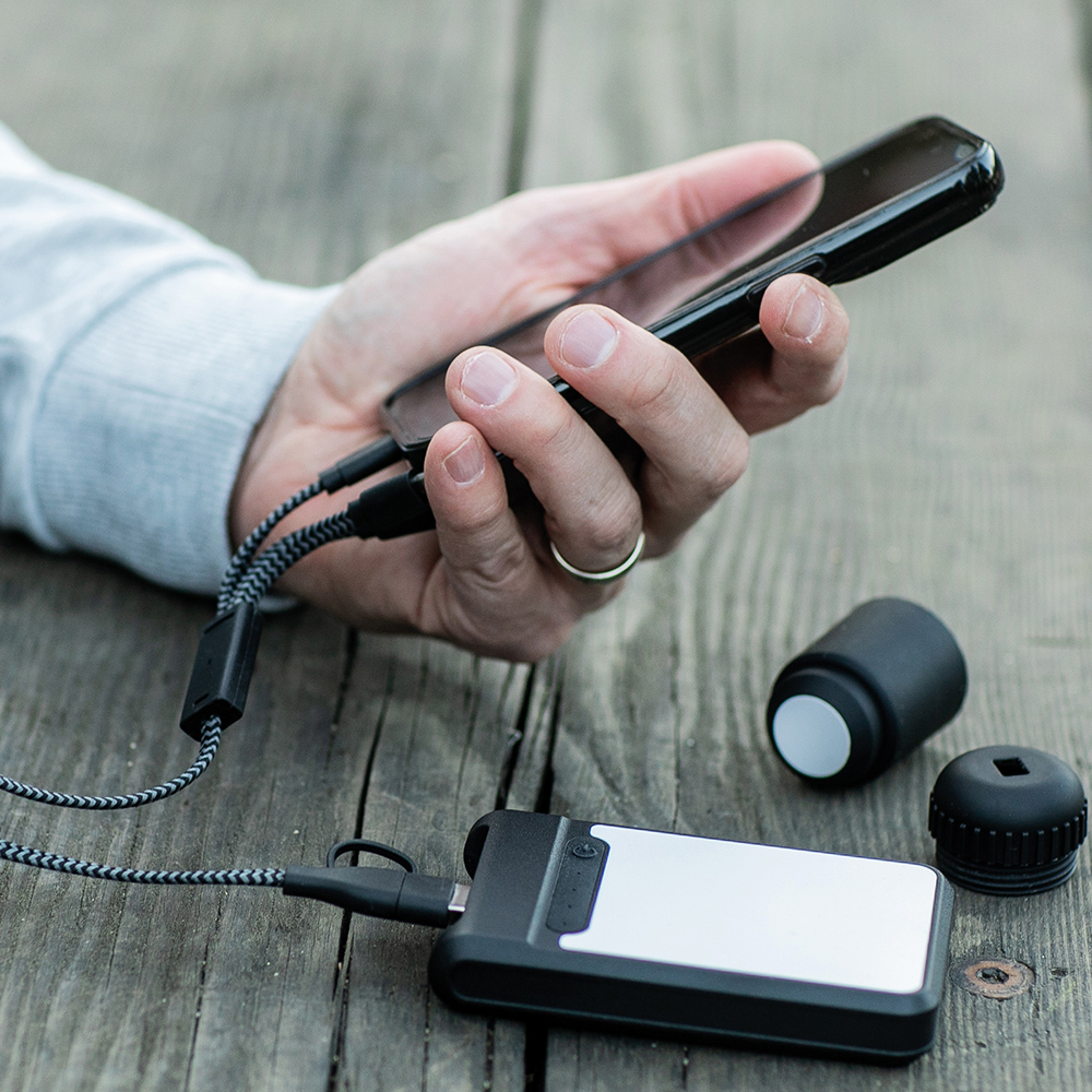 Versacord 5-in-1 fast charge cable tidy made from braided rPET. A sleek, portable pocket-sized powerhouse featuring the following connectors: two USB-C, one USB-A, one Micro USB, and one iOs-compatible cable, all neatly wrapped in a stylish tube made from recycled ABS. The Versacord keeps your connectors organized, protected from damage and always within reach. Packed in a premium kraft box.